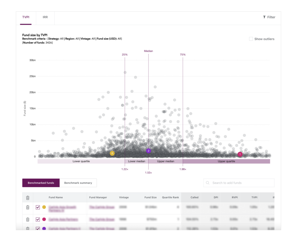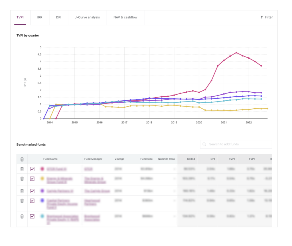 In the Benchmarks section, users can assess a fund’s performance relative to other funds. Users can customise their benchmarking criteria based on their own research needs. One can filter by region, investment strategy, fund size and vintages up to five years around a selected vintage to create a unique benchmark plot graph.